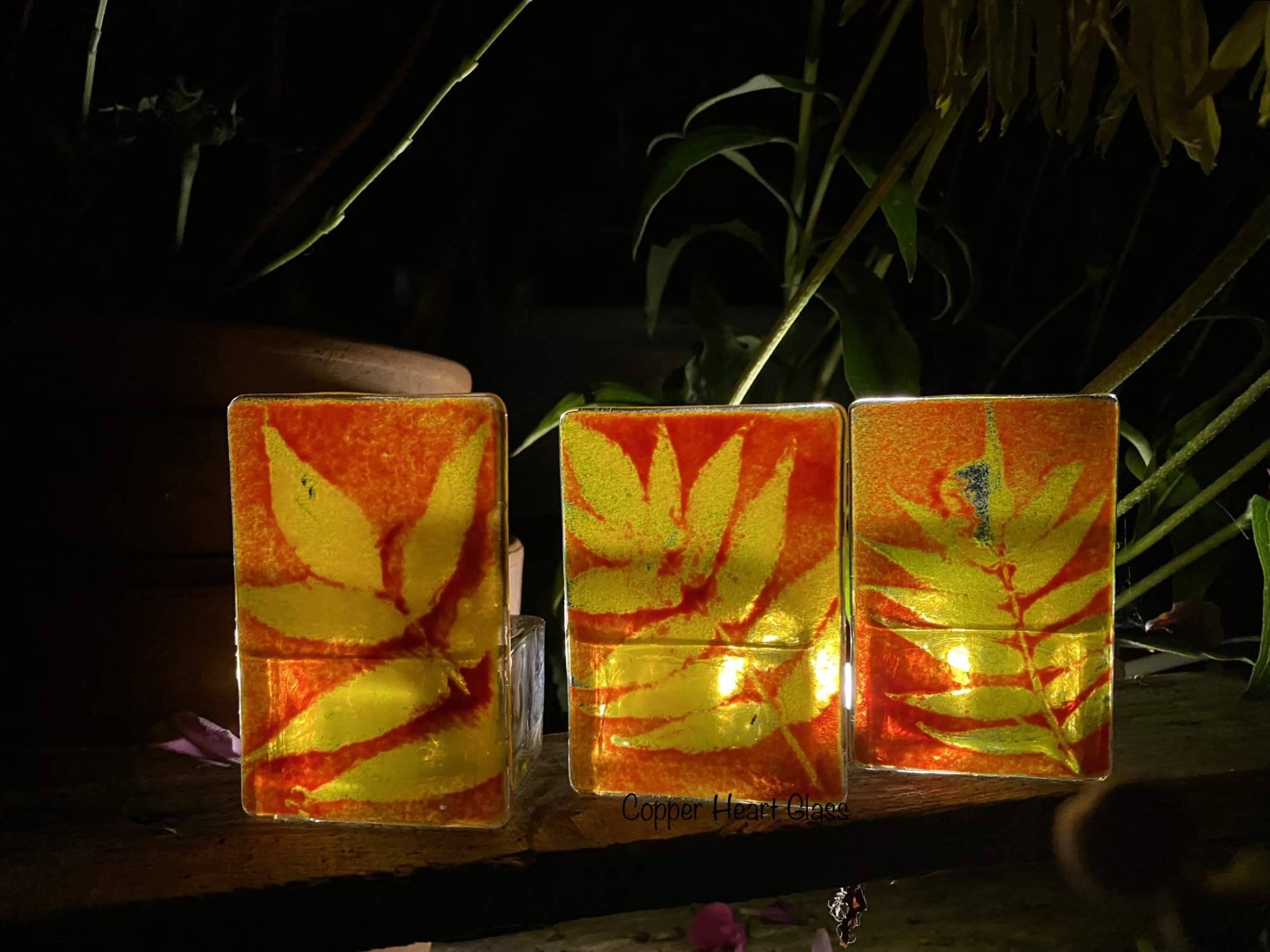 Beautiful red/yellow tealight holder depicting a leaf image.