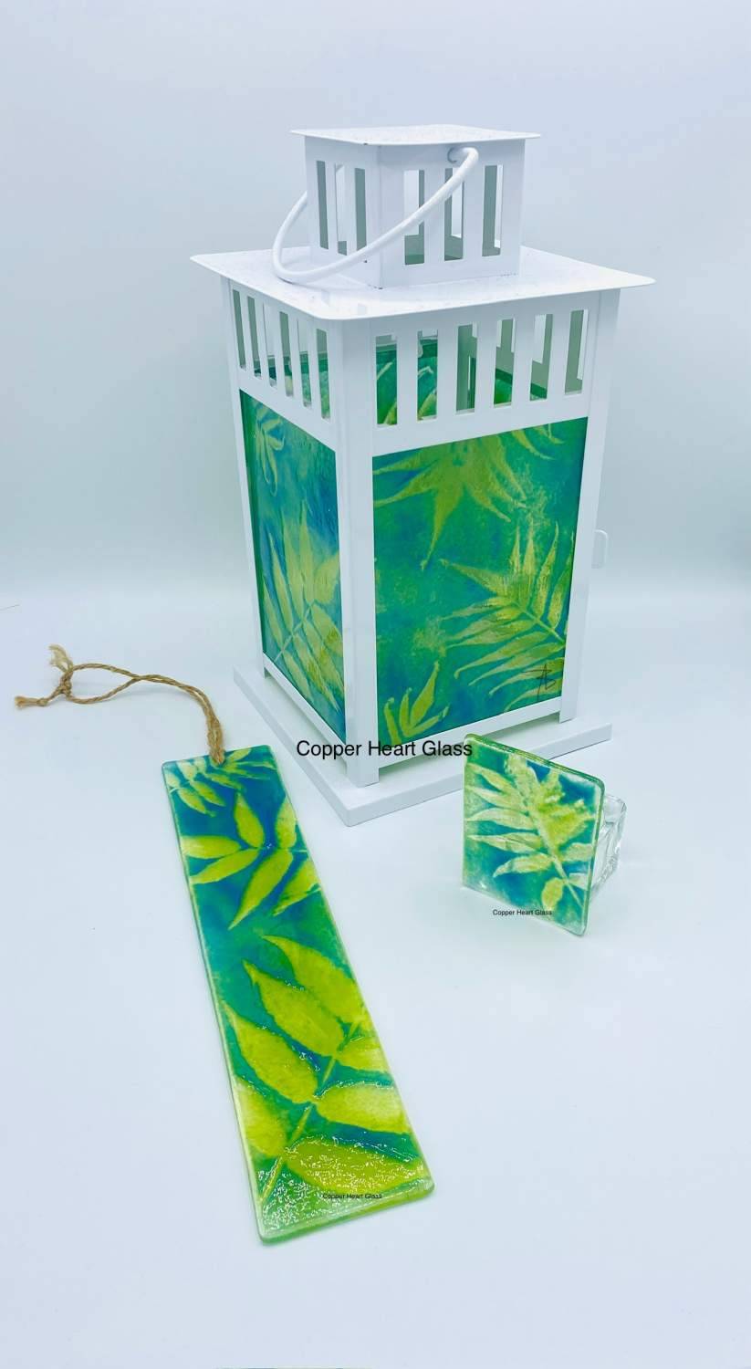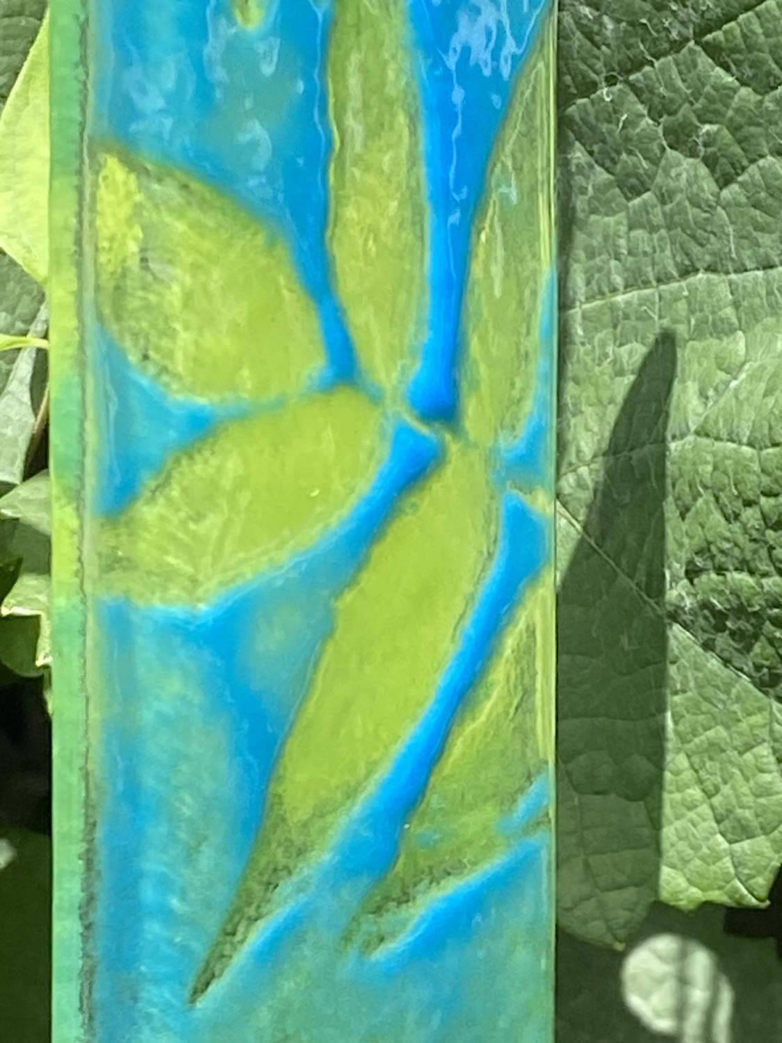 Beautiful blue/green sun catcher/ hanging ornament depicting a leaf image.