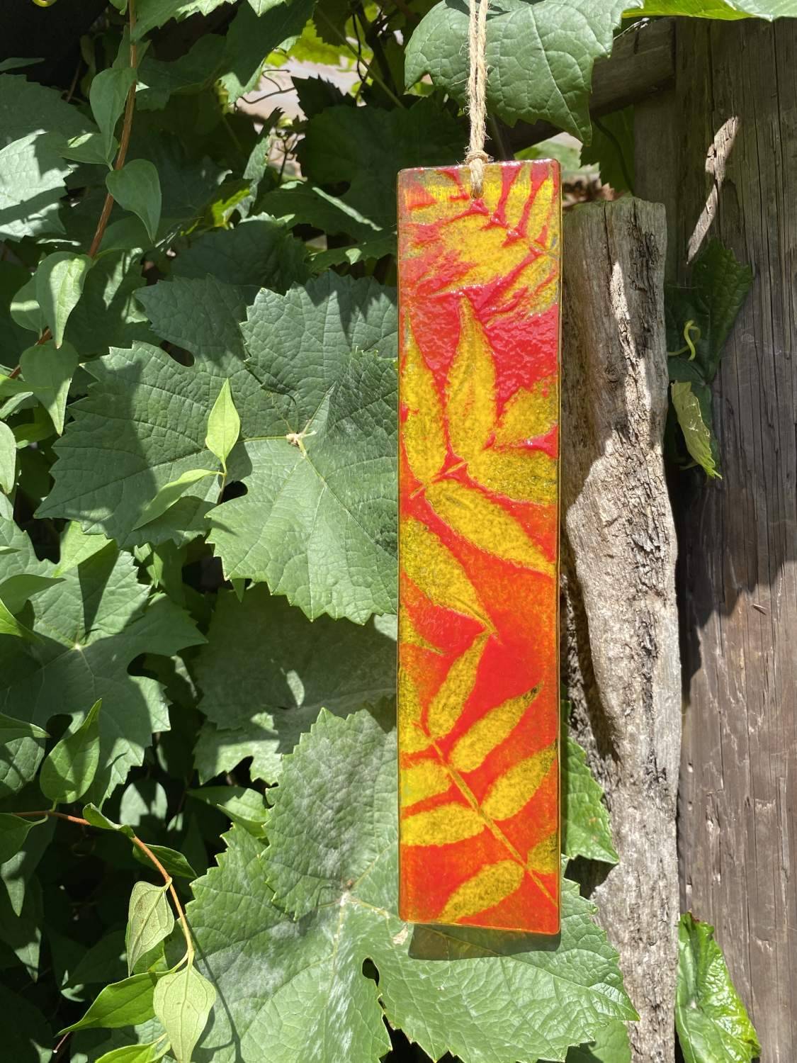 Beautiful red/yellow sun catcher/ hanging ornament depicting a leaf image.